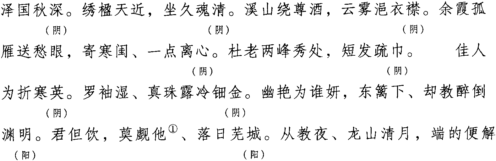 注: 一、本词例押根部 “根” 韵。本押古上平声 “真” 韵,古下平声 “庚”“侵”韵。因“真” “侵”在现代韵中属 “根”韵,“根”韵中的“橙” 与古韵中的“庚” 同韵,故全调亦押“根” 韵。
