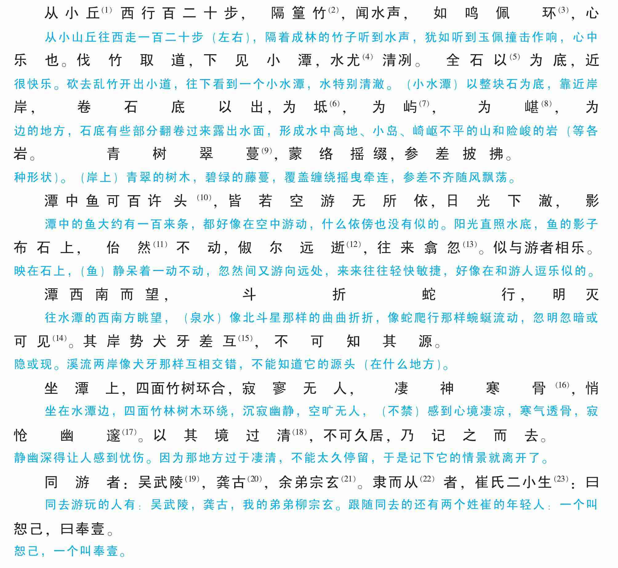 (1) 〔小丘〕 在小石潭东面。 (2) 〔篁竹〕 竹林。 (3) 〔佩环〕 玉质装饰物。 (4) 〔尤〕 格外。 (5) 〔以〕 介词后置, “以全石为底”。 (6) 〔坻〕 水中高地。 (7) 〔屿〕 小岛。 (8) 〔嵁〕 不平的岩石。 (9) 〔翠蔓〕 翠绿的藤蔓。 (10) 〔可百许头〕 大约有一百来条。 可, 大约。 许, 用在数词后表示约数, 相当于同样用法的 “来”。(11) 〔佁然〕 呆呆的样子。 (12) 〔俶尔远逝〕 忽然向远处游去。 (13) 〔翕忽〕 轻快敏捷的样子。 (14) 〔明灭可见〕时而看得见, 时而看不见。 (15) 〔犬牙差互〕 像狗牙那样参差不齐。 (16) 〔凄神寒骨〕 感到心境凄凉, 寒气透骨。(17) 〔悄怆幽邃〕 幽静深远, 弥漫着忧伤的气息。 悄怆, 忧伤的样子。 (18) 〔清〕 凄清。 (19) 〔吴武陵〕 作者的朋友, 也被贬在永州。 (20) 〔龚古〕 作者的朋友。 (21) 〔宗玄〕 作者的堂弟。 (22) 〔隶而从〕 跟着同去。 (23) 〔二小生〕 两个年轻人。