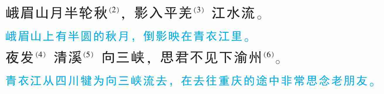 (1)选自 《李太白全集》。 峨眉山, 在现在四川峨眉山市西南。 (2) 〔半轮秋〕 半圆的秋月, 即上弦月或下弦月。(3) 〔平羌〕 即青衣江, 在峨眉山东北。 (4) 〔发〕 出发。 (5) 〔清溪〕 即清溪驿, 在峨眉山附近。 (6) 〔渝州〕 指重庆。