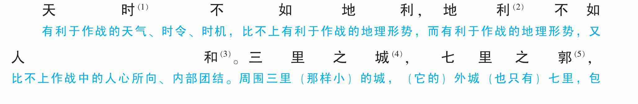 (1)〔天时〕气候时机。(2)〔利〕利益,功用。(3)〔和〕和顺,和谐。(4)〔三里之城〕周围三里(那样小)的城。(5)〔郭〕外城。(6)〔环〕围。(7)〔夫(fú)〕助词,表示要议论。(8)〔然而〕虽然这样,但是。(9)〔池〕护城河。(10)〔兵革〕泛指武器装备。(11)〔委而去之〕意思是弃城而逃。委,放弃。去,离开。(12)〔域民不以封疆之界〕使人民定居下来而不迁到别的地方去,不能靠划定的边疆界限。域,界限,这里意思是限制。(13)〔固国不以山溪之险〕巩固国防,不能靠山河的险要。(14)〔威天下不以兵革之利〕震慑天下,不能靠武力的强大。(15)〔至〕极点。(16)〔畔〕通“叛”。(17)〔顺〕归顺,服从。(18)〔故君子有不战,战必胜矣〕所以君子不战则已,战就一定胜利。君子,指上文所说的“得道者”。