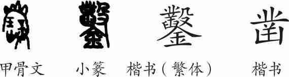 “凿”是象形兼会意字。甲骨文像手持辛凿在山里凿之形。小篆改为从金,从辛(表示錾凿)从臼(表示坑洞),会凿坑洞之意。隶变后楷书写作“鑿”。汉字简化后写作“凿”。