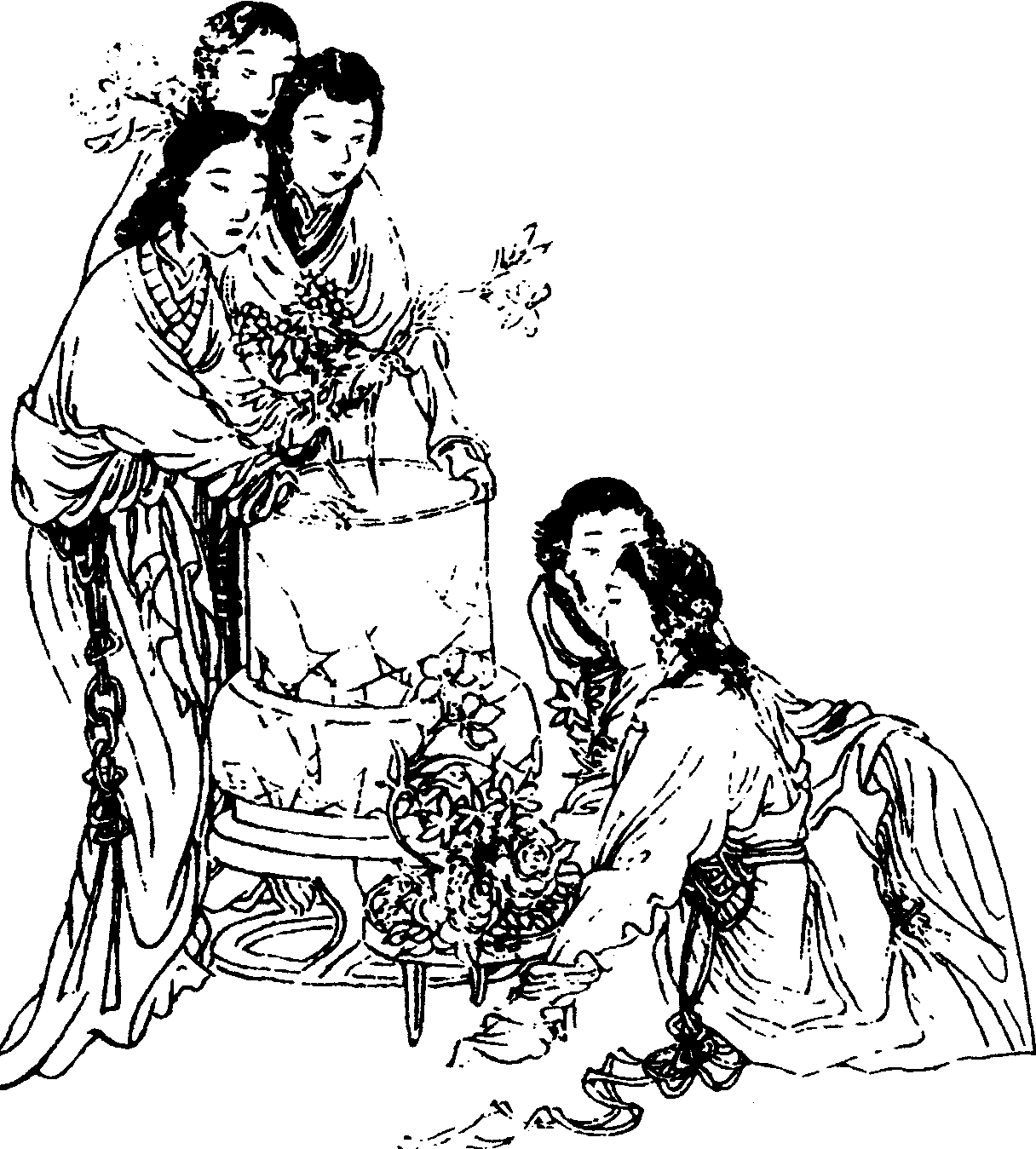 [柳叶儿]则教你怎生消受,我索合再做个机谋。把这云鬟蝉鬓妆梳就,(带云)还再穿上些锦绣衣服,(唱)珊瑚钩、芙蓉扣,扭捏的身子儿别样娇柔。