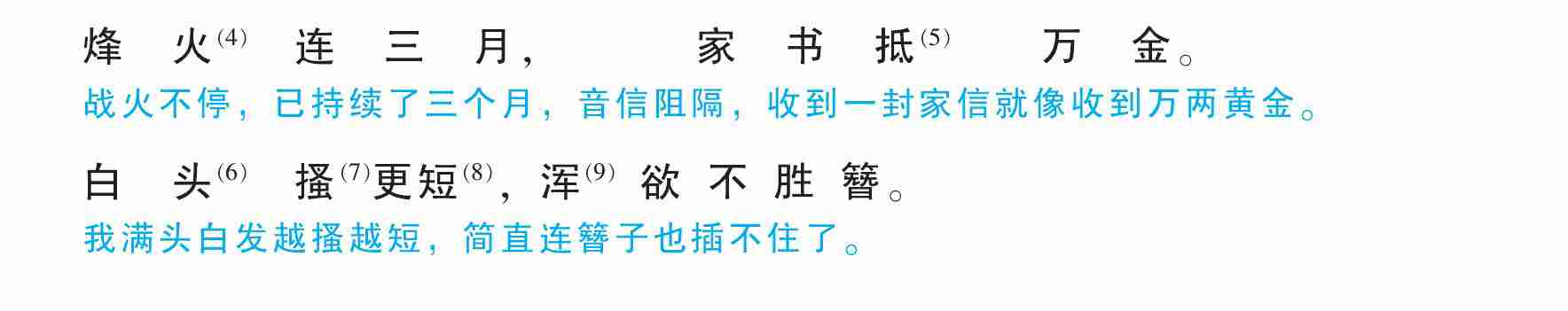 (1) 〔国〕 国都, 京城, 这里指长安。 (2) 〔城〕 长安城。 (3) 〔深〕 茂盛, 繁多。(4) 〔烽火 〕 古时边防报警烟火 , 这里指安史之乱的战火 。 (5) 〔抵 〕 值 。 (6) 〔白头 〕 白发 。 (7) 〔搔 〕抓, 挠。 (8) 〔短〕 少。 (9) 〔浑〕 简直。
