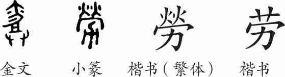 “劳”是会意字。金文从廾(双手),从爵(酒器),会双手举爵以酒对辛劳有功者进行慰问犒劳之意。隶变后楷书写作“勞”。汉字简化后写作“劳”。