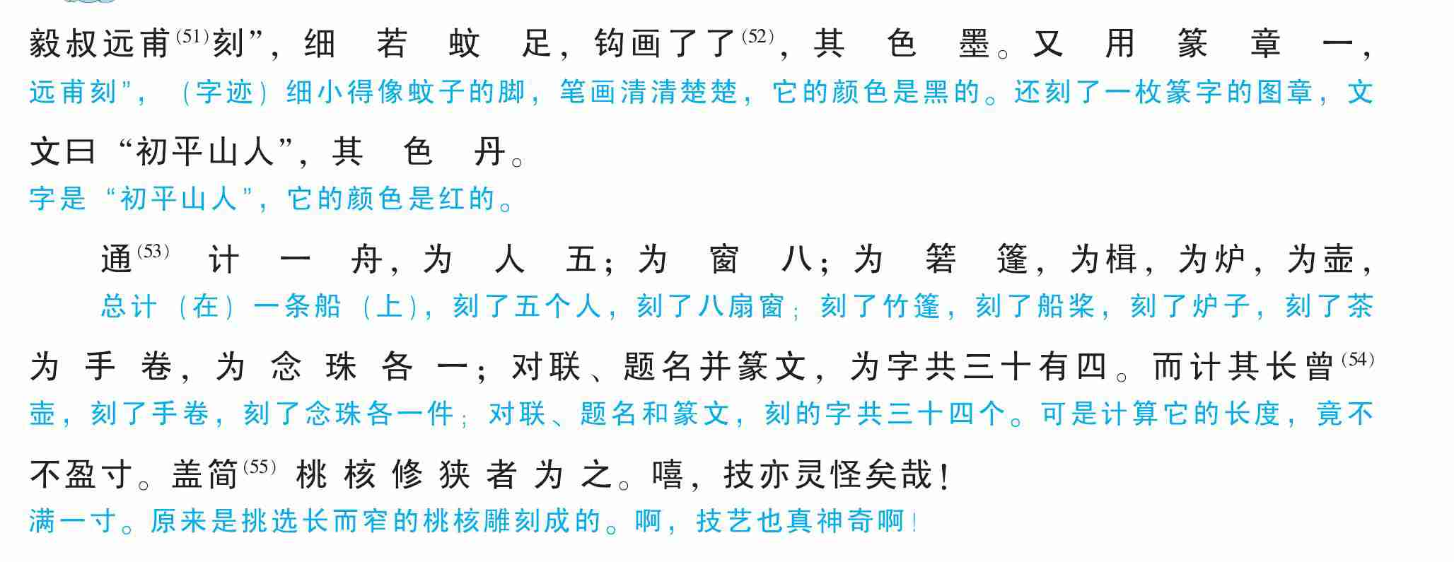 通(53)计一舟,为人五;为窗八;为箬篷,为楫,为炉,为壶,为手卷,为念珠各一;对联、题名并篆文,为字共三十有四。而计其长曾(54)不盈寸。盖简(55)桃核修狭者为之。嘻,技亦灵怪矣哉!