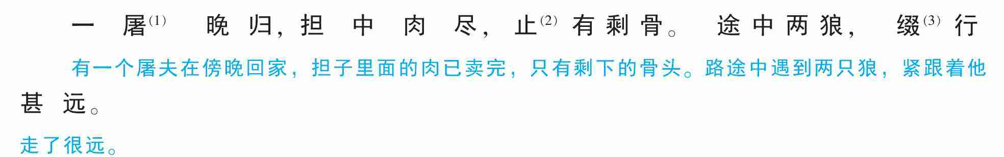 一屠晚归,担中肉尽,止(2)有剩骨。途中两狼,缀(3)行甚远。
