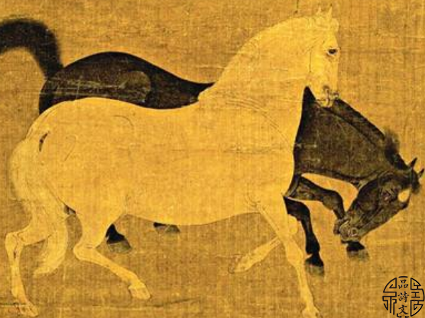 这篇画赞尤其精妙之处,更在于作者由绘形传神进而写出群马的气韵和风度。它们既不像头带羁络的“厩马”,而又体态中度有别于“野马”。它们无营无求,无拘无束,从容闲暇,潇洒自得,犹如贤大夫贵公子解带脱帽、临流濯缨,神态极为飘逸。这一精湛的比喻,可谓深得韩幹马图的神韵。“遂欲高举远引”而不可得,只好优游卒岁等语,以观画而诱发的幽想逸思,更进一步地摹写出韩幹笔下神品超拔旷远的精神内蕴。