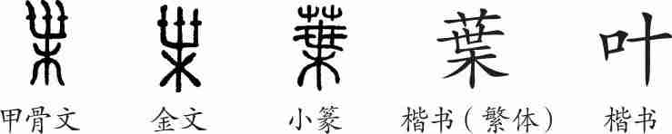 “叶”为形声字。甲骨文像一棵树叶繁茂的大树,上部的小点表示树叶所在。金文与甲骨文大致相同。小篆承接金文。隶变后楷书写作“葉”。汉字简化后写作“叶”。