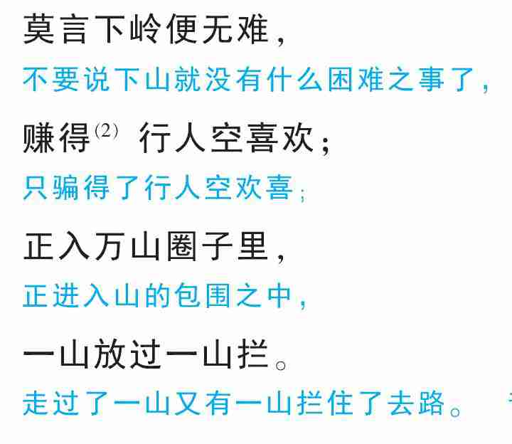 解题: 诗人把 “行人” “下岭” 时的心理写得生动有趣, 虽未明言劝诫, 而读者自知其中蕴含着人生的普遍道理: 上山难下山易, 却不知下山之后仍要上山。