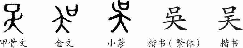 “吴”是会意字。从口,从夨(zè)(像头的动作),会晃着头大声说话之意。隶变后楷书写作“吳”。汉字简化后写作“吴”。