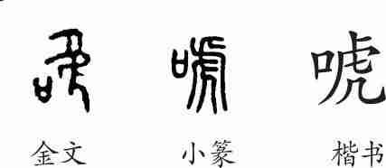 “唬”是会意兼形声字。金文从口从虎会意,虎兼表声。小篆承接金文,并整齐化。隶变后楷书写作“唬”。