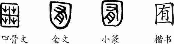“囿”是会意字。甲骨文像一个周围有院墙、中间有树苗的苗圃。金文从口,有声。小篆的形体整齐化。隶变楷书后写作“囿”。