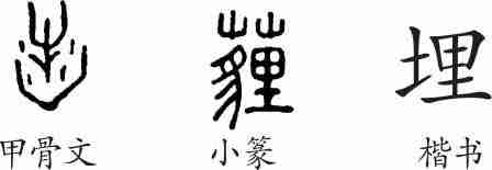 “埋”是会意字。甲骨文下部的曲线表示一个土坑,中间是“牛”,两侧的四点,表示填的土,会把牛埋于地下之意。隶变后楷书写作“埋”。