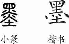 “墨”是会意兼形声字。小篆从黑,从土会意。“黑”兼表声。隶变后楷书写作“墨”。