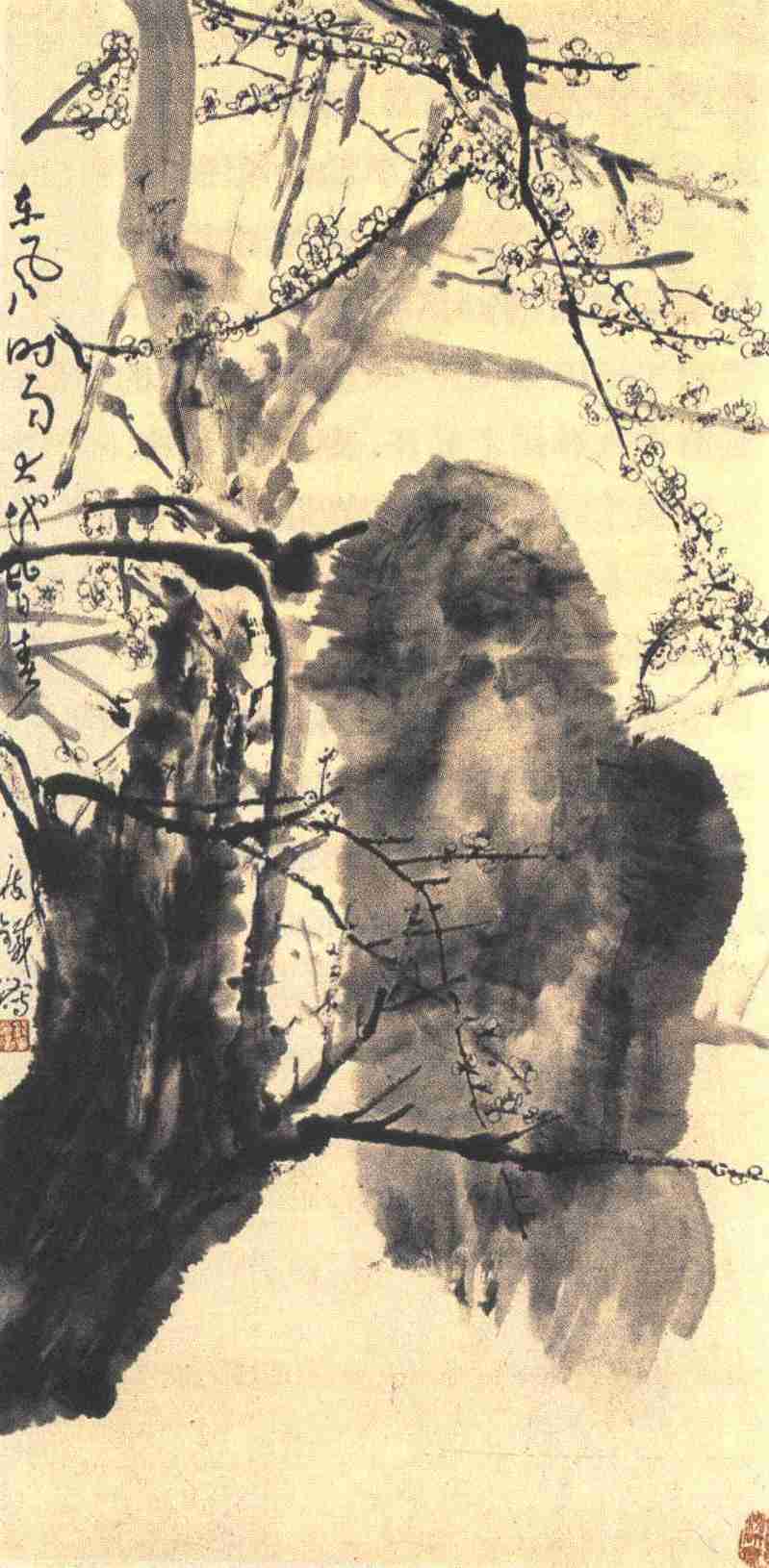 《墨梅图》乃钱氏水墨花卉中之代表作。所作奇古朴茂,苍中有翠,枝本全用篆籀笔意抒写,发枝圈花,则以汉隶之笔出之,显得凝重中有婀娜,老辣中见清新。风骨奇峭,冷香逼人,具有“檐头冷蕊,风外清香”之姿。石块以泼墨、渍墨滃成,再以略浓之墨破,画得苍中有秀,是块雨后大石,有助于对花枝的衬托。全画有清冷的朦胧美。作者题有八字:“东风时雨,大地皆春。”许是春寒料峭的时候吧。