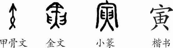 “寅”是象形字。甲骨文从矢,从囗(箭函),会从函中请出箭矢来之意。金文左右均为手,像双手捧矢。篆箭头讹变成“宀”。隶变后楷书写作“寅”。