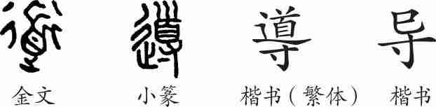 “导”是会意字。金文从行(十字路口),从首(人),从止(脚),会人在十字路口需要引导之意。隶变后楷书写作“導”。汉字简化后写作“导”。