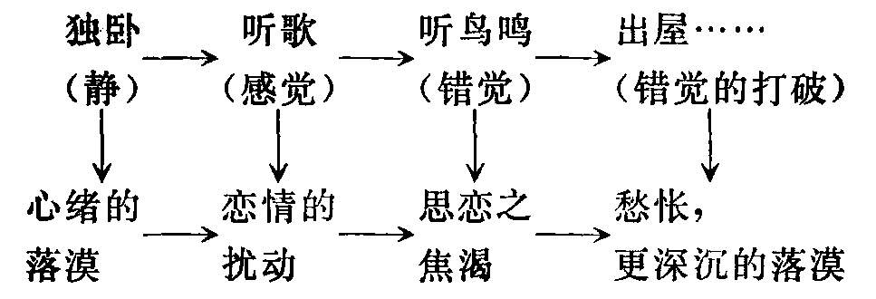 这首歌不像有的情歌那样直接抒发情怀,它的抒情全在叙事中进行。歌中有一个约略可知的小故事,带有灵而动变的情节性。我们看到:在一个幽寂的夜里,主人公独卧在床,听到外面传来歌声,他抑或想起昔日与情人的对歌吧,一种莫名其妙的愁闷不觉袭入心头;接着,又听到鸟儿的鸣叫,他怀疑那个情人惊动鸟儿,寻找自己来了;于是,连忙外出观看,不见人影,原来是风儿吹动竹林发出了扰人心绪的声音。最后,真相大白,主人公便在叹息声中点明心迹:“啊!总是心切怀旧人。”循着这条线索,我们可以获得这样一个叙事——抒情结构: