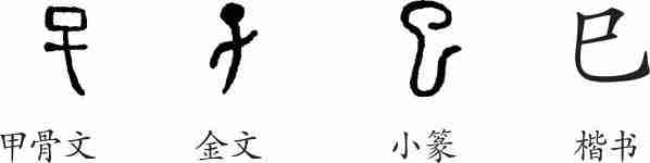 “巳”为象形字。甲骨文像在胎胞中生长的小儿。金文的形体大致相同,但是跟人的形象更接近了。小篆发生讹变。隶变后楷书写作“巳”。