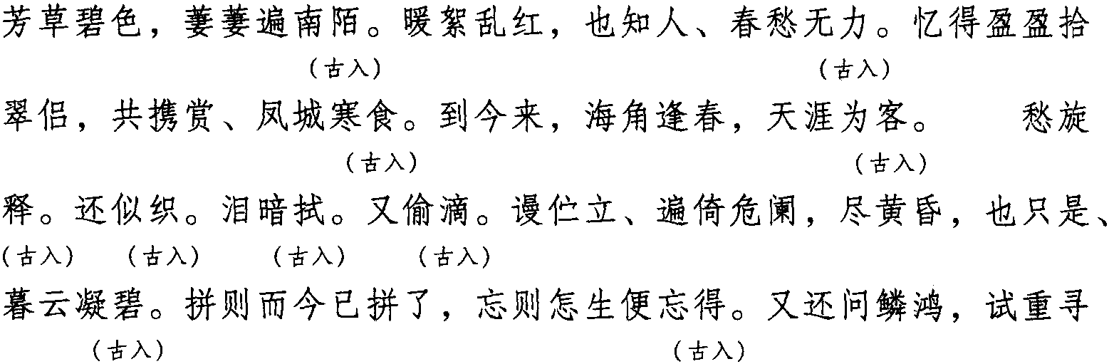 注:本词例押古入声“陌” “锡” “职”韵。因“陌” “锡” “职”在古韵中与“碧” “寂” “力” 同韵,而“碧” “寂” “力”在现代韵中属“衣”韵,故全调可押衣部“衣” 韵。