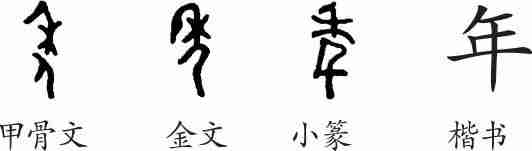 “年”本为会意字。甲骨文从禾,从人,会禾谷成熟,人在负禾之意。金文承接甲骨文而来。小篆变为从禾、千声的形声字。隶变后楷书写作“年”。