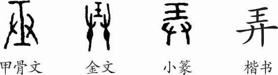“弄”是会意字。甲骨文和金文皆从廾,从玉,会双手把玩玉璧之意。小篆整齐化。隶变后楷书写作“弄”。