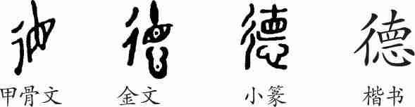 “德”是会意字。甲骨文从彳,从直,会视正行直之意。金文另加义符“心”,突出心地正直之意。小篆承接金文。隶变后楷书写作“德”。