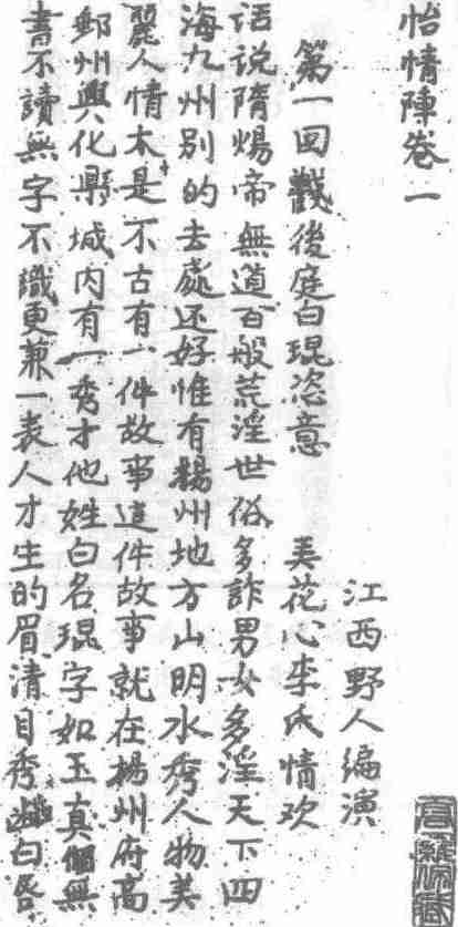 清代白话长篇艳情小说。两卷十回。题“江西野人编演”,其真实姓名不详。成书于清嘉庆年间。
