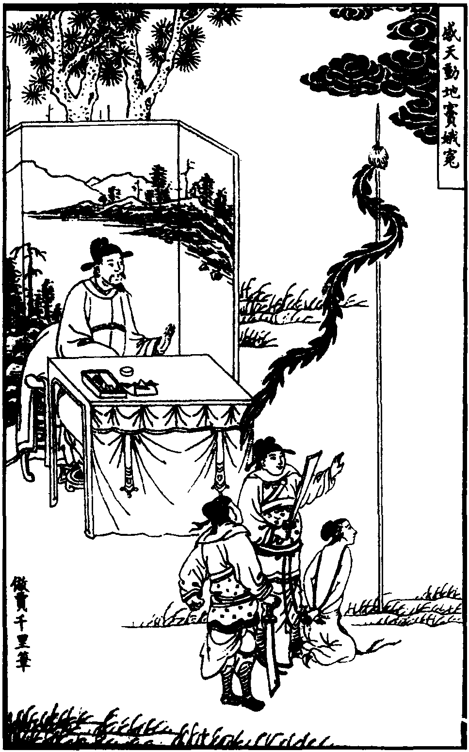 【耍孩儿】不是我窦娥罚下这等无头愿,委实的冤情不浅。若没些儿灵圣与世人传,也不见得湛湛青天。我不要半星热血红尘洒,都只在八尺旗枪素练悬,等他四下里皆瞧见。这就是咱苌弘化碧,望帝啼鹃。
