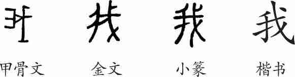 “我”是象形字。甲骨文上部是三锋的戈,有一个长柄。金文线条化了,但仍与甲骨文相似。小篆已经看不出兵器的形象了。隶变后楷书写作“我”。