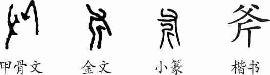 “斧”是形声字。甲骨文从斤(斧头),父声。金文变化不大。小篆变为上声下形的形声字。隶变后楷书写作“斧”。