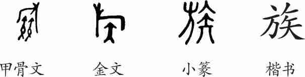 “族”是会意字。甲骨文从(旗帜),从二矢,像旗下聚众矢之状。金文省为一矢。小篆整齐化。隶变后楷书写作“族”。