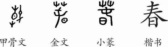 “春”是会意兼形声字。甲骨文从日,从艸,从屯(像草木钻出地面之形),屯兼表声。小篆基本上同于金文,只是“屯”的曲笔朝右拐。隶变后楷书写作“春”。