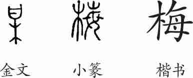 “梅”是会意兼形声字。金文从木从甘会意。“楳”是“某”的分化字,“梅”是“楳”的借用字。如今规范化,以“梅”为正体。