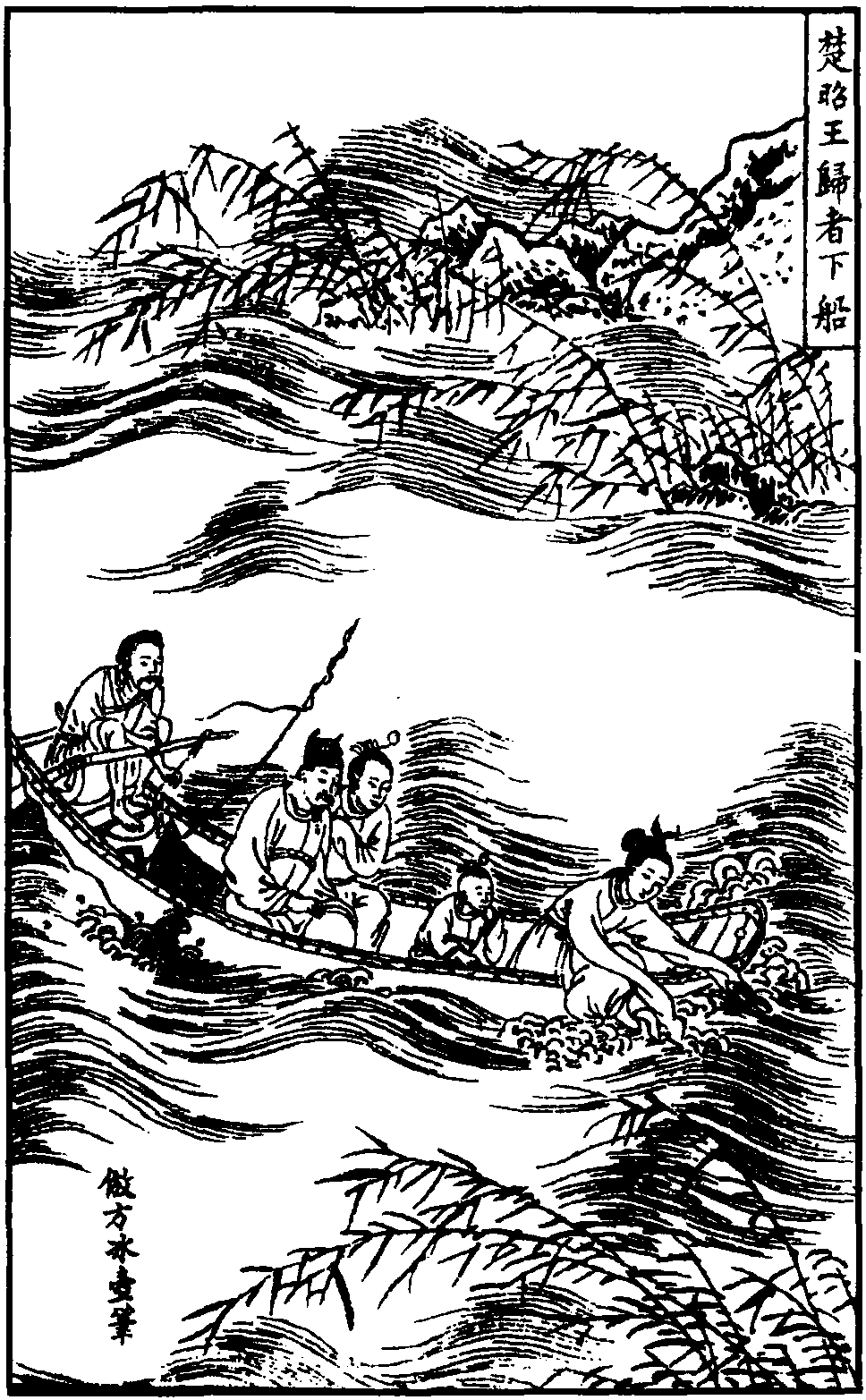 《楚昭公疏者下船》 杂剧写春秋时吴楚交兵,楚败,楚昭公带领妻、子及兄弟仓惶出逃。第三折是全剧故事情节的主体和高潮。楚昭公一行四人搭一渔船逃难,江风大作,船不堪载,艄公请亲属中疏者下船。夫人及公子先后投水,为龙神所救。风浪平息,楚王兄弟各自逃命。剧的结尾是申包胥赴秦搬来救兵,伍员领吴兵退去,楚昭公与生还的妻、子及兄弟重新团聚,并与秦国结为姻亲。