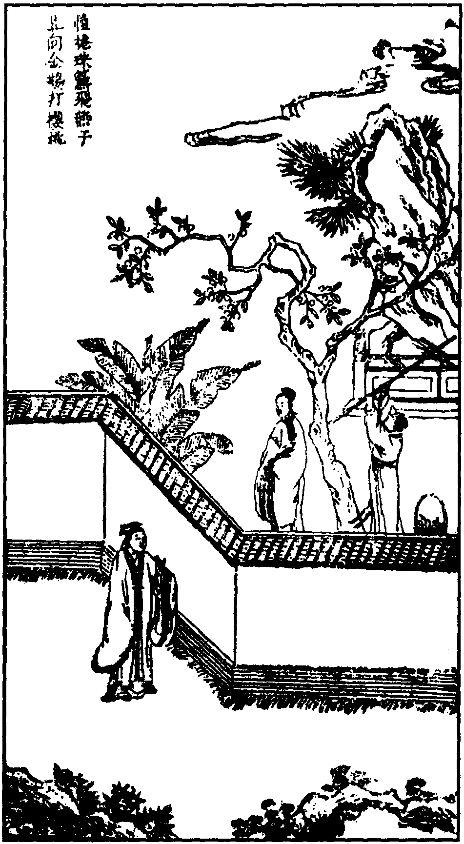 【醉宜春】 (旦)金鹅,池塘幽雅,奈草池夜雨,溅湿凌波。(占)小姐,这樱桃比前大多了。(旦)樱桃近可,日影斜颜色无多。(占)小姐,前日还多,如今一发少了。(旦) 知么,况兼鸟雀屡经过,留得珊瑚几颗。(占) 只有这个了,待我掇过梯子摘下来。(旦) 呆丫头,这树小怎用梯子,取竿儿打下来便是。(占) 这是了,待我取竿子来打。(旦) 只把小竿数尺,打将他堕。(占打樱桃入书案介)