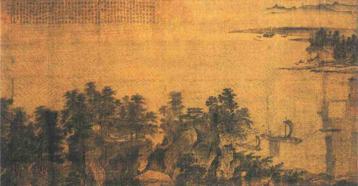 此图的风格从北宋转向南宋,在两宋山水画史上具有特殊意义。就表现方式而论,既有别于北宋,也不同于南宋,既继承北宋传统,又预示南宋特色。图中景致:上部一片粼粼江水,空阔旷远,风帆出没其间;下部横列一排山峰,高低参差,连绵不断。山峰上丛林密布,宫观楼阁半隐半现。值得注视的是那条有栏杆的小道,弯弯曲曲地从右下方趋向左上方,随山势的高低,忽藏忽露,而且绕过山后而再现于远处,终乃到达山巅,形成画中山峦部分的轴心线,也体现画家对山峦之美的艺术创造。在北宋山水画中时常发现这种以山径动向引出审美层次的表现形式,例如范宽的《雪山萧寺图》轴、燕文贵的《溪山楼观图》轴、传为赵佶的《雪江归棹图》卷、王希孟的《千里江山图》卷以及佚名院画家的《江山秋色图》卷、李唐的《万壑松风图》轴等等,皆然。