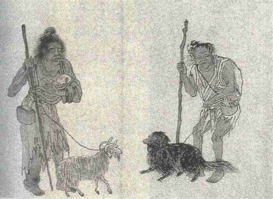 图册共十二开,画有二十五个乞丐形象,基本上是一开两人,无任何背景。所画老、幼、妇、壮均有,其中一部分是身有残疾、完全丧失劳动能力的人,一位双足俱坏、爬行在地的老妇,似乎在向路人跪拜乞求哀悯。一位双目失明的瞎子,靠狗来引路,已足堪怜,而与之相邻的一位瞎眼婆婆,就更令人见之酸鼻,她不但双目失明,一足痈疽溃疡不利行动,而且怀中还有一个呱呱待哺的婴儿。另一部分尚有一些劳动能力,但由于长期缺食,严重营养不良,只剩皮和骨,形同枯槁。他们无论得到什么食物,都是狼吞虎咽,甘之如饴。另一部分人则不甘心完全乞讨,多少靠一点自己力量,或驯服蛇、松鼠、猴等动物,当众表演;或持竹板,挎小鼓,唱莲花落。另外有两人脸上都化了妆,一黑一白,足着麻鞋,可能是装扮民间传说中勾魂使者黑、白无常,是为人家办丧事而来的。内中还有一僧一道,僧人托钵化缘,道士怀抱鱼鼓,唱道情,实际都是乞丐。还有两个女性,一较为年长,一正在妙龄,较之其他乞丐,她们不但衣服整洁,而且眉目清秀俊丽,然而却背负包裹,匆匆路隅,显然她们原来生活并不困难,是在特殊情况下被迫过着行乞生活。那么作者为什么把这些不同的乞丐集中起来加以描绘呢?周臣自己题跋中说:“正德丙子秋七月,闲窗无事,偶记素见市道丐者往往态度,乘笔砚之便,率尔图写,虽无足观,亦可以助警励世俗云。”“正德丙子”为正德十一年(1516)。周臣是吴郡(今江苏苏州)人,未闻其远游,“素见市道”,应当是指当时的苏州地区。民谚云:“上有天堂,下有苏杭。”“天堂”尚且如此,全国其他地方可想而知。