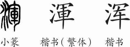 “浑”是形声兼会意字。小篆从水,軍声,軍兼表像军行之意。隶变后楷书写作“渾”。汉字简化后写作“浑”。