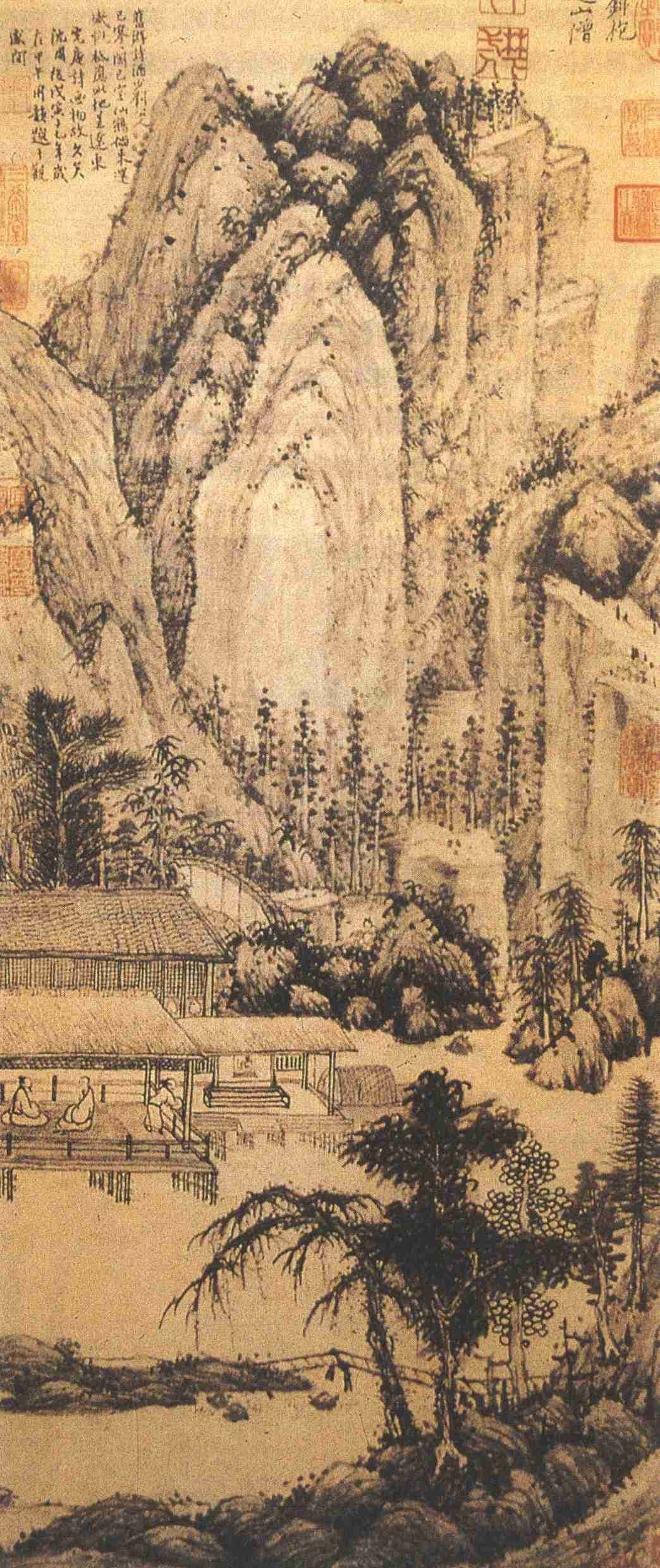 刘珏生活在明代前期,绘画深受元黄公望、王蒙、吴镇等影响。《吴中往哲像赞》称其“山水出王叔明”,进而上追董、巨;《吴郡丹青志》载:“刘公写山水泉深石乱,木秀云生,绵密幽媚,风流蔼然。高者攀鳞巨老(巨然),庶乎升堂,特未入室耳。”此图为中年作品,已具有艺术特征。结构缜密,轩后林木掩映,群山高耸,轩前溪流萦回,稠密中透出空明,把观者视线引向画面中轴——清白轩及轩内的人物。近处板桥坡树,在布局上起平衡与延伸作用,得象外之趣。山势起落圆浑,间以坡石、“矾头”的点苔和简笔丛林与圆点、介字点相交织,疏密有致,表现出溪山深秀之美,也吸收了巨然江南山水之长。笔触凝重、墨色醇厚而有神采,则取法吴镇。通过密中透空、委婉深远的艺术形式,使景物的灵秀与人物的悠闲契合无间,达到了文人画所追求的物我合一境界。
