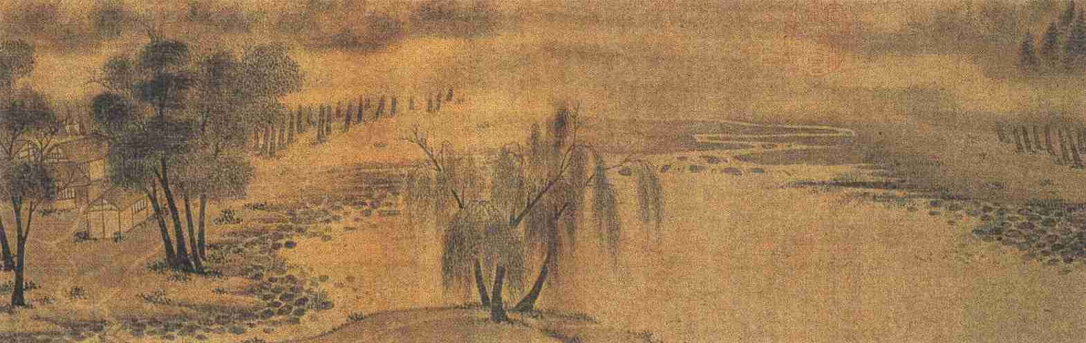 此图作于元符三年(1100)。图绘江湖平远小景,湖庄临岸,垂柳拂溪,池塘荷叶点点,堤坡绿树成荫,境界幽美恬静。远处林渚在层层烟雾笼罩下,时隐时显,富有滋润迷濛感,也增添了景色的空间深度。幽静的环境,郁葱的山川,清润的大气,深远的空间,组成一幅光影交辉、变幻无穷、如梦如诗的优美意境,犹如一曲宛转清丽的抒情交响乐。这种重在抒情、富有诗意的山水画,不仅显示了江湖小景的特色,也反映了山水画由着重表现客观美景和理想境界向更多抒发情绪联想和主观意趣的转变契机。这一转变自北宋开始,至南宋遂蔚然成风。