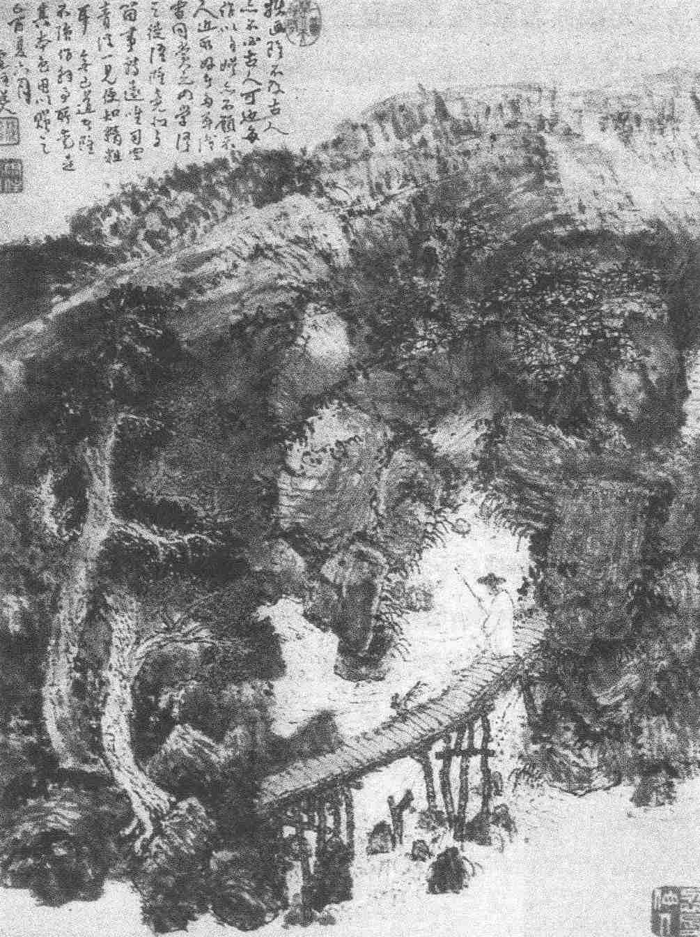 首先,景物蓊郁,结构深邃,和叔明是一家眷属,但曲折辟涩之趣,则从现实(例如牛首山)中来。画面主要是山石,其组合与造形也别具匠心。叔明画石大都三角形与多角形相交错,石谿却兼以四方形,于是山石之折搭、盘亘、层叠、横斜,每因方形介入,而愈加奇诡动人。其次,近处溪上山石,左右峙立,有板桥相连;远处山石,直插水中,石之左右溪流潆洄,由缓而急,桥下水与碎石湍激,遂成溅瀑;桥上一人戴笠,策杖,俯视溪水,而山右石径微露,点明他从何处来。画家便是这样描绘主人公与自然的接触和感受,赋予作品以审美主题。再次,左方大树,一点叶、一夹叶,右方崖际一松倒悬,松叶剔笔,而树身俱向右倚;图之上方,冈峦数重则向左斜落,杂树、苔点亦随之而左;这右向与左向的、隐约可见的轴线形成均衡,使形象结构趋于平稳。另一方面,山石皴法用淡墨披麻,线条较密,几无空隙,却具浅深之致,此为石公独创。石上更作若干凸面,却不再渲晕,遂觉几处空白与多层次的淡墨相掩映,产生节奏与运动。最后,综观全图,正是这平稳与节奏、静与动,交织而成艺术的气氛、境界,画中人或画家自己便陶醉其中。他毕生都是“云山犹向画中寻”,石谿的确不是“闲汉”。