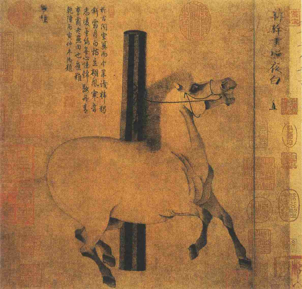 韩幹画迹留传甚少,这幅《照夜白图》是较为可信的。画面十分简单,一桩拴一马,但马的气势非凡,如生如动。