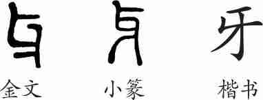 “牙”是象形字。金文的形体像两枚上下交错对合的兽牙的形状。小篆的形体整齐化。隶变后楷书写作“牙”。