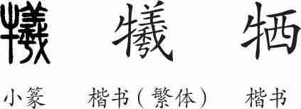 “牺”是会意兼形声字。小篆从牛从羲会意,羲兼表声。隶变后楷书写作“犧”。汉字简化后写作“牺”。