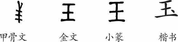 “玉”是象形字。甲骨文像用一根绳子串吊着三块玉石。金文和小篆都很像“王”字,但实际上不一样。隶变后楷书写作“玉”。