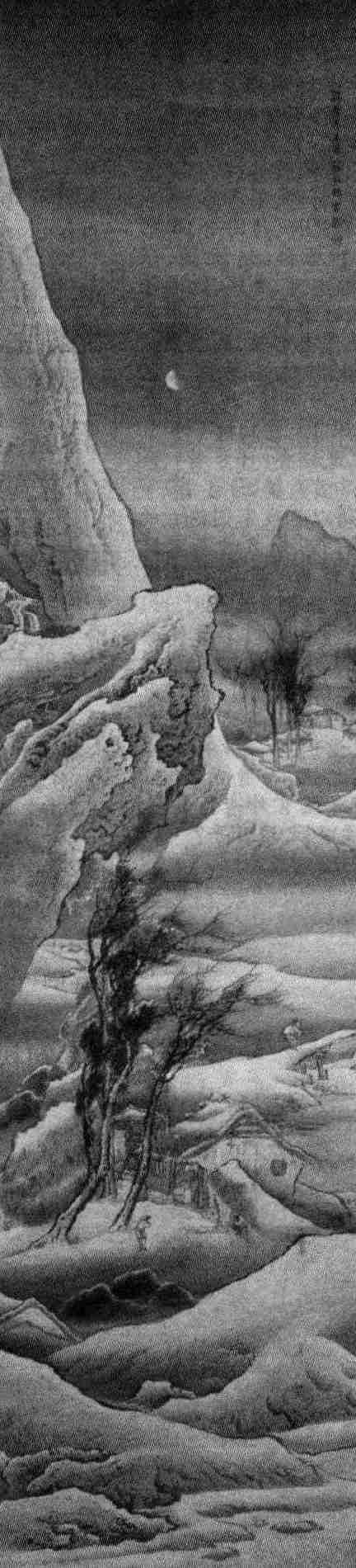 这繁复的辞藻、迂回的抒情、动词的选用以及曲折的笔法,处处都向我们暗示着,词中描写的新月,并不是如李端在《拜新月》中所写闺中女子见到的新月:“开帘见新月,便即下阶拜。”也不是如李白在《静夜思》中所见的明月:“举头望明月,低头思故乡。”王沂孙所要写的,并不是眼前的一轮新月,而是他内心有着寄托和隐喻的新月。清代的张惠言曾评论道:“碧山咏物诸篇,并有君国之忧。此喜君有恢复之志而惜无贤臣也。”(《茗柯词选》)清代谭献也认为:“‘便有’四句,寓意自深,音辞高亮。”(《复堂词话》)即便我们不质实地认为“新月”暗喻的便是宋度宗,词中含有言外之意也是显而易见的。“最堪爱”两句,再次写景,以婉约的字词描摹新月的优美,但落在“冷”字上,表明着内心的失落与哀愁无告。此一“冷”字,既是对上阕“悬柳”“谁在”“未稳”“离恨”所有情感的总结,也是开启下阕的门户。