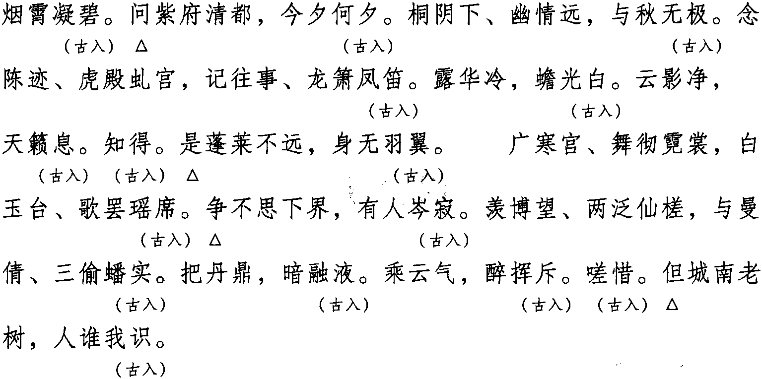 注:本词例押古入声“质” “陌” “锡” “职” 韵。因在现代韵中,“质” 属“衣” 韵,“陌” “锡” “职” 与“碧” “觅” “力” 亦同 “衣” 韵,故全调可押衣部“衣”韵。