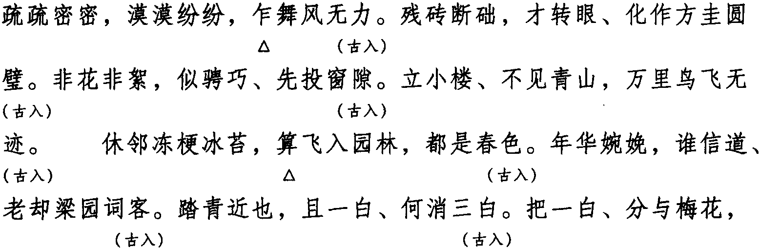 注:本词例押古入声“职” “陌” 韵。因 “职” “陌” 在古韵中与“力” “碧”同韵,而“力”“碧”在现代韵中属“衣”韵,故全调可押衣部“衣”韵。