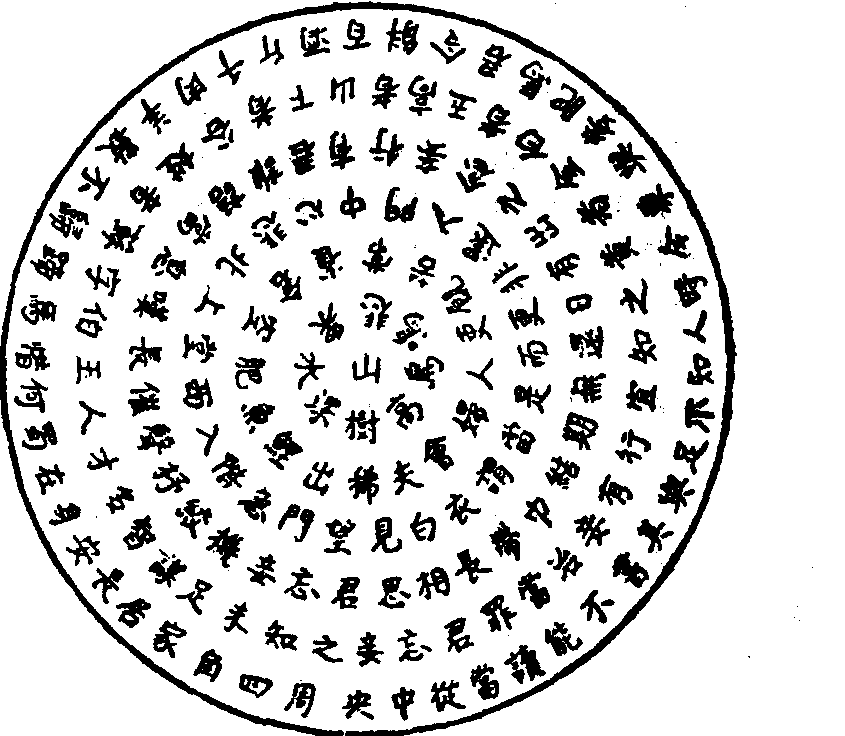 乍一看,一只圆盘里写满字,囫囵吞枣,不知怎么回事。其实它是从中央以周四角,宛转回环地表达伤别离愁的杂言诗。整理出来便是:山树高,鸟鸣悲。泉水深,鲤鱼肥。空仓雀,常苦饥。吏人妇,会夫稀。出门望,见白衣。谓当是,而更非。还入门,中心悲。北上堂,西入阶。急机绞,杼声催。长叹息,当语谁?君有行,妾念之。出有日,还无期!结巾带,长相思。君忘妾,未知之。妾忘君,罪当治。妾有行,宜知之。黄者金, 白者玉。高者山,下者谷。姓为苏,字伯玉。人才多,智谋足。家居长安身在蜀,何惜马蹄归不数?羊肉千斤酒百斛,令君马肥麦与粟。今时人,智不足,与其书,不能读,当从中央周四角!这首诗是一首比较典型的以三言为主的民间乐府,有着汉代民歌的形式特征,语言质朴,感情挚切,直而不野,句法活泼跳跃,富有艺术魅力。在内容上,它与现实社会生活结合紧密,女主人抒发的感情显示出汉代的思想格调。